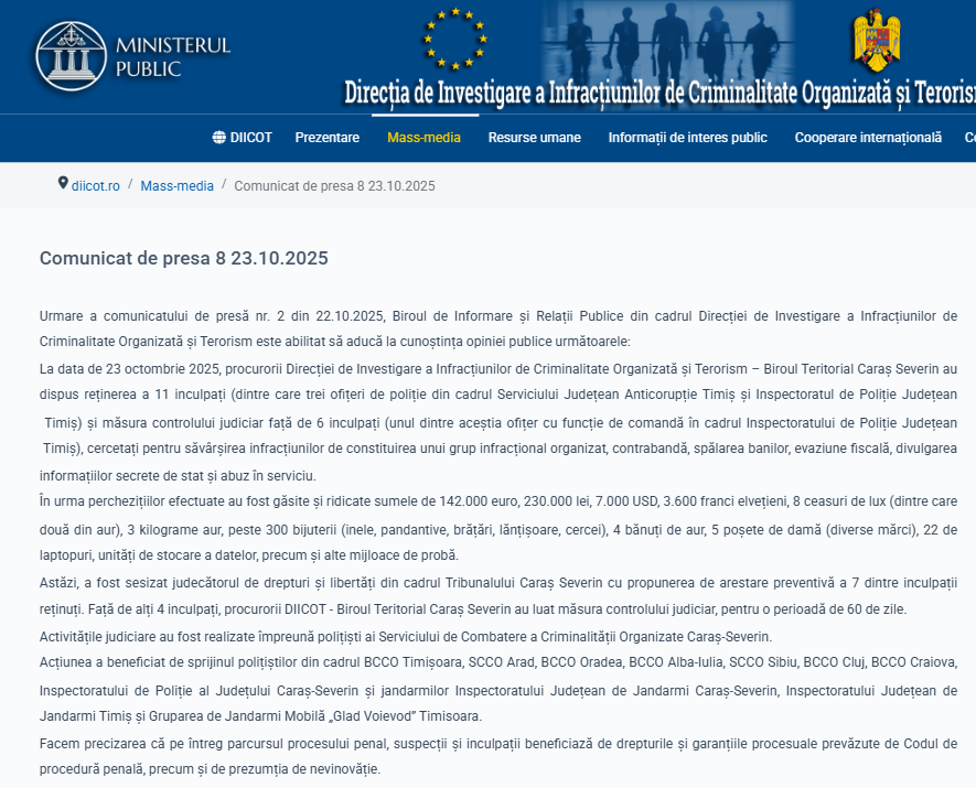 ” Urmare a comunicatului de presă nr. 2 din 22.10.2025, Biroul de Informare și Relații Publice din cadrul Direcției de Investigare a Infracțiunilor de Criminalitate Organizată și Terorism este abilitat să aducă la cunoștința opiniei publice următoarele: