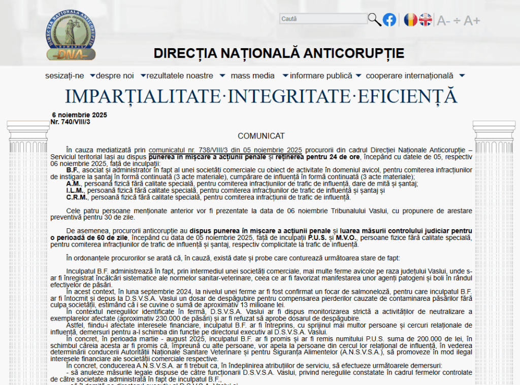 Direcția Națională Anticorupție – Serviciul teritorial Iași a anunțat luarea unor măsuri preventive într-o anchetă care vizează presupuse acte de corupție legate de activitatea unor ferme avicole din județul Vaslui și încercări de influențare a deciziilor unor instituții publice din domeniul sanitar-veterinar.