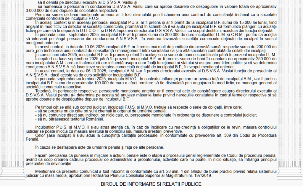 ” În cauza mediatizată prin comunicatul nr. 738/VIII/3 din 05 noiembrie 2025 procurorii din cadrul Direcției Naționale Anticorupție – Serviciul teritorial Iași au dispus punerea în mișcare a acțiunii penale și reținerea pentru 24 de ore, începând cu datele de 05, respectiv 06 noiembrie 2025, față de inculpații: