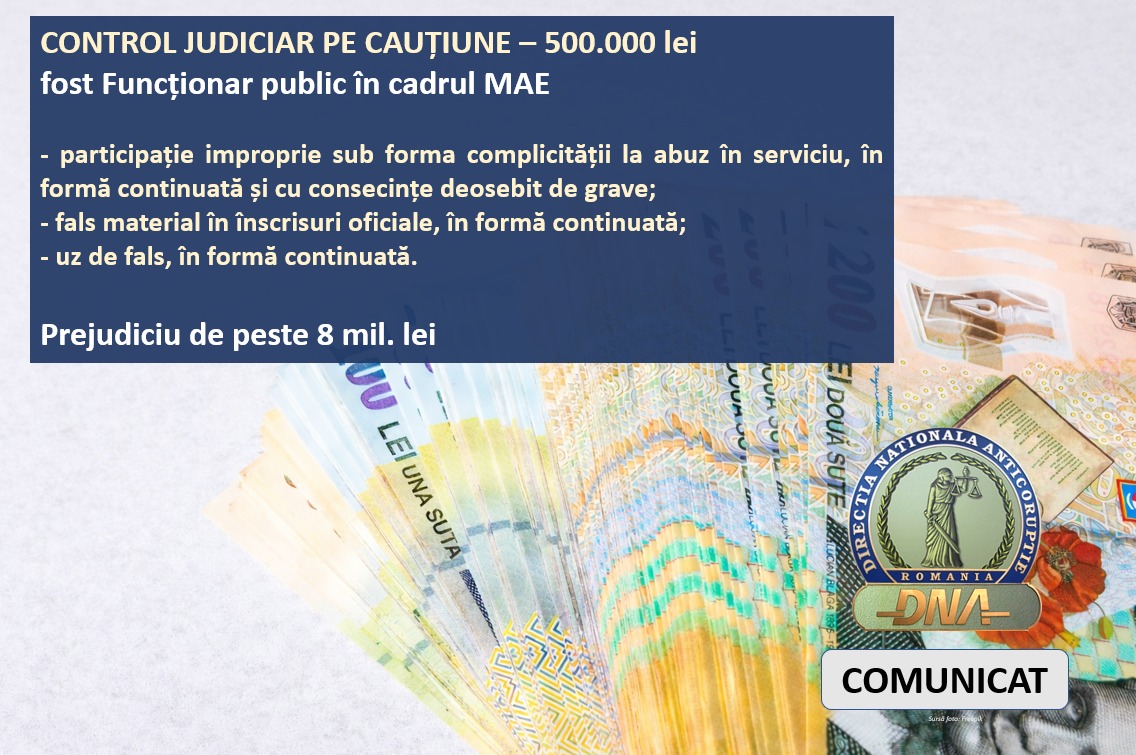 „În continuarea comunicatului nr. 14/I-36 din 22 ianuarie 2026, vă aducem la cunoștință faptul că procurorii din cadrul Direcției Naționale Anticorupție – Secția de combatere a infracțiunilor asimilate infracțiunilor de corupție au dispus punerea în mișcare a acțiunii penale și luarea măsurii controlului judiciar pe cauțiune, pe o perioadă de 60 de zile, începând cu data de 22 ianuarie 2026, față de inculpata PĂUNE LAVINIA-DANIELA, la data faptelor consilier relații în cadrul Direcției Planificare Bugetară, Contabilitate și Salarizare (D.P.B.C.S.) din cadrul Ministerului Afacerilor Externe, pentru săvârșirea infracțiunilor de: