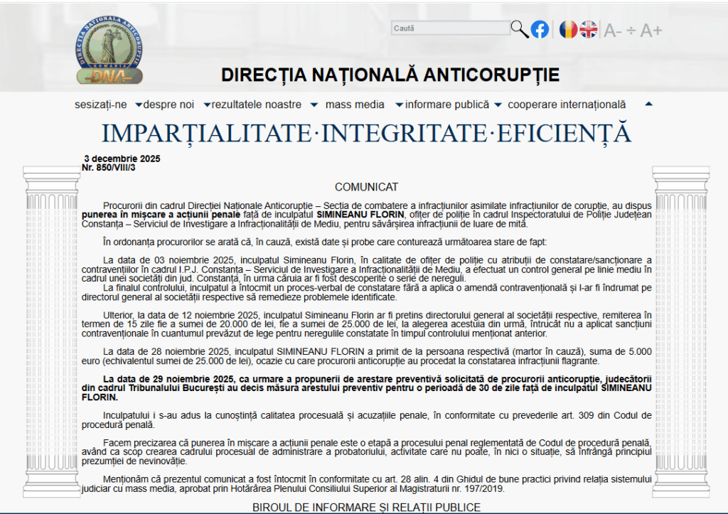 Procurorii DNA au declanșat urmărirea penală împotriva ofițerului de poliție Simineanu Florin din cadrul IPJ Constanța – Serviciul de Investigare a Infracționalității de Mediu, acuzat că ar fi cerut mită pentru a nu sancționa o firmă din județ în urma unui control de mediu. După ce, la începutul lunii noiembrie, ar fi descoperit nereguli și ar fi decis să nu aplice amendă, ofițerul ar fi pretins 20.000 – 25.000 de lei pentru „clemența” sa. Pe 28 noiembrie 2025, polițistul a fost prins în flagrant, primind 5.000 de euro de la directorul societății, moment în care procurorii au intervenit. A doua zi, Tribunalul București a dispus arestarea preventivă a acestuia pentru 30 de zile. DNA subliniază că acțiunea penală este o etapă procedurală care nu înlătură prezumția de nevinovăție.