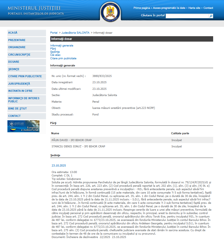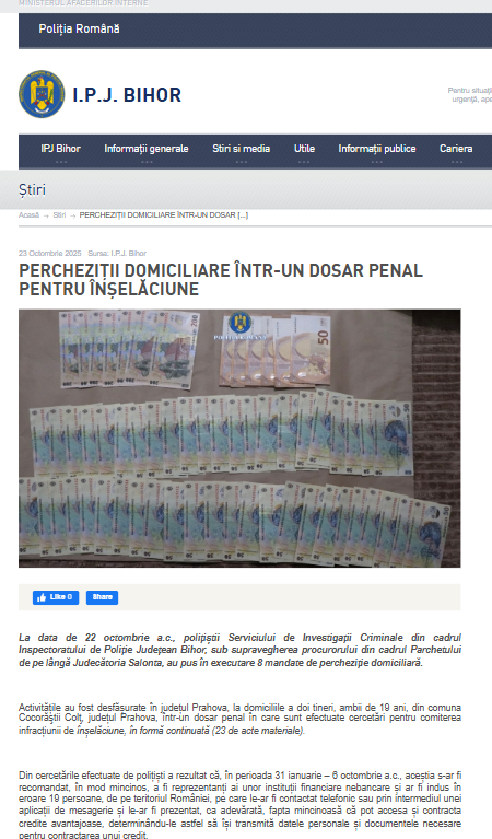 La data de 22 octombrie 2025, polițiștii Serviciului de Investigații Criminale Bihor, sub coordonarea Parchetului de pe lângă Judecătoria Salonta, au efectuat 8 percheziții domiciliare în județul Prahova, la locuințele a doi tineri de 19 ani din comuna Cocorăştii Colţ, transmite Inspectoratul de Poliție Județean Bihor prin purtătorul de cuvânt al Instiuției – Comisar Șef Dna Fărcuța Alina. Aceștia sunt bănuiți că, între ianuarie și octombrie 2025, s-au prezentat fals ca reprezentanți ai unor instituții financiare nebancare, înșelând 19 persoane din țară prin promisiunea unor credite avantajoase. Cu datele obținute, au contractat fraudulos credite în numele victimelor, cauzând un prejudiciu total de aproximativ 60.000 de lei. Cercetările în cadrul dosarului penal sunt efectuate pentru comiterea infracțiunii de înșelăciune, în formă continuată (23 de acte materiale). În urma perchezițiilor au fost ridicate telefoane, calculatoare, dispozitive de stocare și 23.700 de lei. Cei doi – Păun David și Stanciu Denis Ionuț- ambii fără atecedente penale au fost reținuți pentru 24 de ore, iar ulterior, la propunerea Parchetului de pe lângă Judecătoria Salonta, instanța a dispus arestarea lor preventivă.