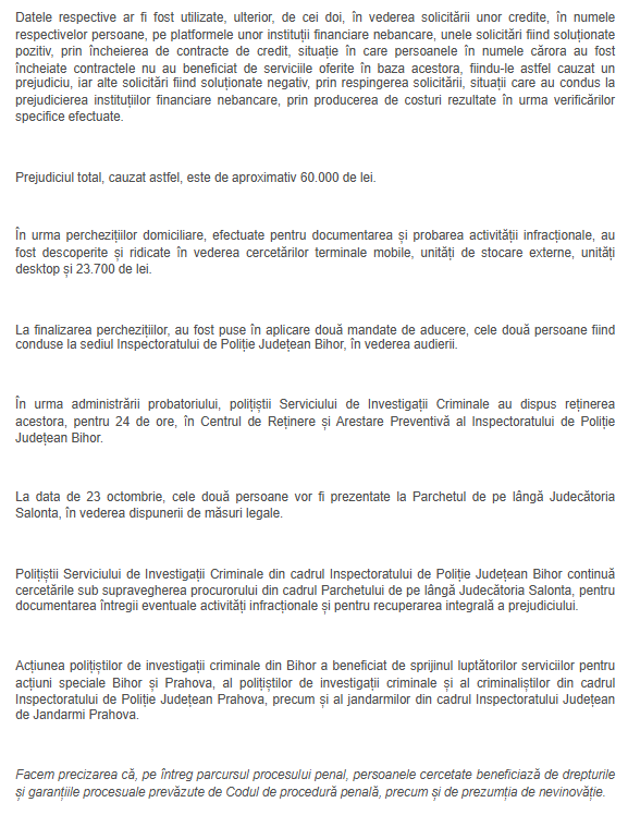 Datele respective ar fi fost utilizate, ulterior, de cei doi, în vederea solicitării unor credite, în numele respectivelor persoane, pe platformele unor instituții financiare nebancare, unele solicitări fiind soluționate pozitiv, prin încheierea de contracte de credit, situație în care persoanele în numele cărora au fost încheiate contractele nu au beneficiat de serviciile oferite în baza acestora, fiindu-le astfel cauzat un prejudiciu, iar alte solicitări fiind soluționate negativ, prin respingerea solicitării, situații care au condus la prejudicierea instituțiilor financiare nebancare, prin producerea de costuri rezultate în urma verificărilor specifice efectuate.