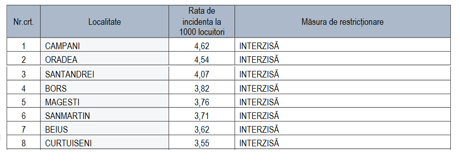 CJSU Bihor a anunțat, marți, că în Bihor mai sunt 16 localități în care rata de infectare cu SARS-CoV-2 depășește 3 la mie. Este vorba despre Câmpani, Oradea, Sântandrei, Borș, Măgești, Sânmartin, Beiuș, Curtuișeni, Rieni, Nucet, Sârbi, Vârciorog, Balc, Paleu, Nojorid și Pomezeu.