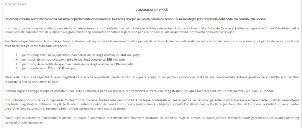 Înalta Curte de Casație și Justiție a făcut publică o expertiză contabilă independentă care demonstrează că legea inițiată de Guvernul Bolojan nu realizează o simplă ajustare tehnică, ci desființează în mod substanțial pensiile de serviciu ale magistraților, transformându-le în indemnizații mai mici decât pensiile contributive, în ciuda contribuțiilor plătite integral în sistemul public. Analiza tehnică relevă reduceri cuprinse între 36% și 51% pentru toate gradele de jurisdicție, ceea ce echivalează cu eliminarea unei garanții constituționale esențiale pentru independența justiției și creează un precedent fără analogie în legislația statelor membre ale Uniunii Europene.