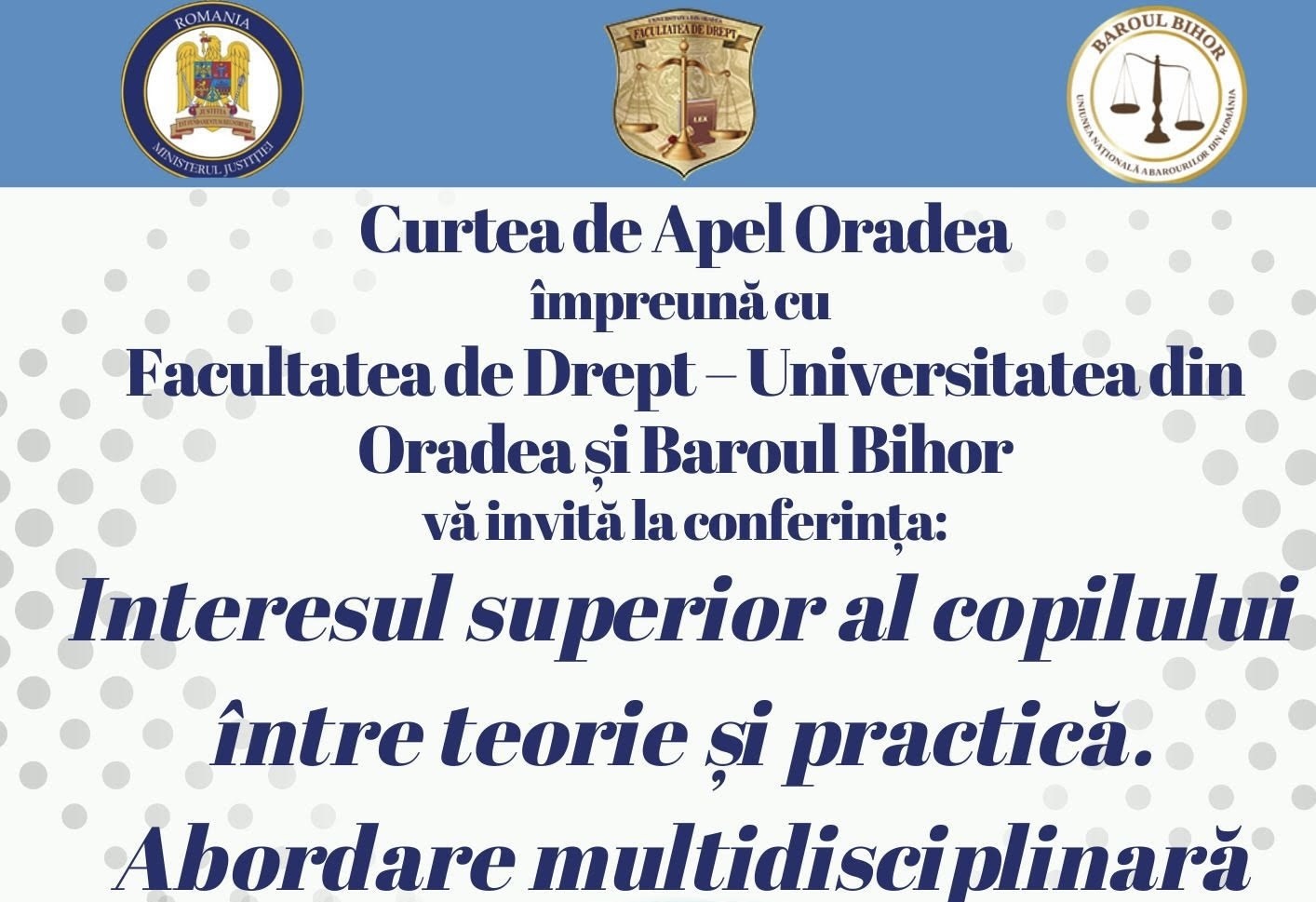 În acest cadru, Curtea de Apel Oradea, alături de Facultatea de Drept a Universității din Oradea și Baroul Bihor, organizează cea de-a doua ediție a conferinței interdisciplinare dedicate interesului superior al copilului în perioada 20-21 noiembrie.