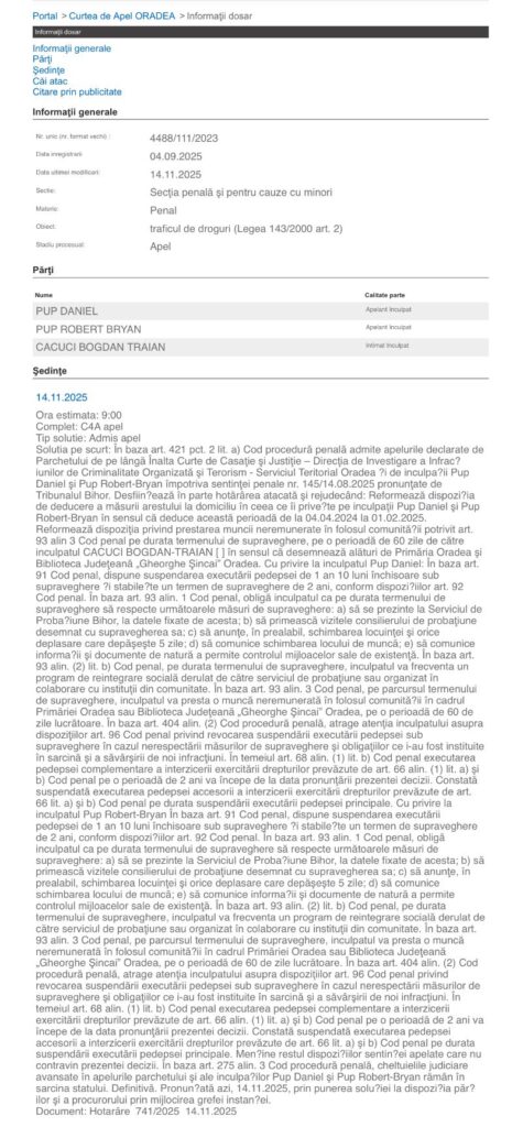 Curtea de Apel Oradea a pronunțat, în 14 noiembrie 2025, decizia definitivă în dosarul de trafic de droguri de mare risc instrumentat de DIICOT Oradea, în care au fost judecați Pup Daniel, fiul său Pup Robert-Bryan și Cacuci Bogdan-Traian. Cei trei au făcut parte dintr-o rețea locală care vindea 3-CMC („cristal”) și ecstasy în municipiul Oradea.