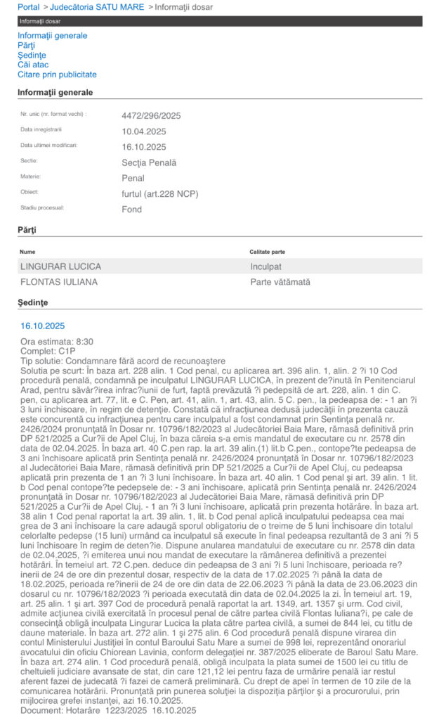 Prin sentința penală pronunțată în 16 octombrie 2025, Judecătoria Satu Mare a condamnat-o pe Lingurar Lucica la 1 an și 3 luni de închisoare pentru furt. Deoarece aceasta fusese deja condamnată anterior la 3 ani de închisoare printr-o hotărâre a Judecătoriei Baia Mare (sentința penală nr. 2426/2024, definitivă prin decizia Curții de Apel Cluj nr. 521/2025), instanța a dispus contopirea pedepselor.