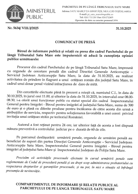 Procurorii Parchetului de pe lângă Tribunalul Satu Mare, împreună cu ofițeri ai Direcției Generale Anticorupție – Serviciul Județean Anticorupție Satu Mare, au organizat la 31 octombrie 2025 un flagrant în urma căruia un cetățean român din județul Satu Mare a fost prins în timp ce oferea mită unui funcționar public din cadrul Inspectoratului General pentru Imigrări – Biroul pentru Imigrări Satu Mare.