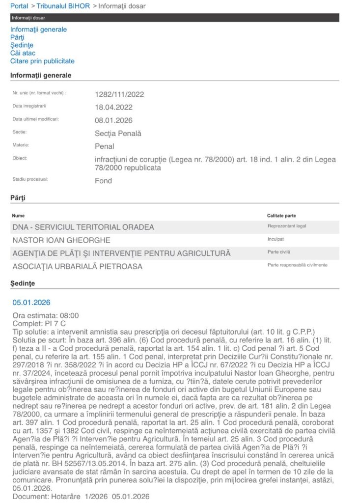 Tribunalul Bihor a pus capăt unui dosar penal vechi de peste un deceniu, în care Nastor Ioan Gheorghe, fost președinte și reprezentant legal al Asociației Urbariale Pietroasa, era acuzat că ar fi obținut pe nedrept fonduri europene prin neactualizarea datelor privind suprafețele agricole declarate.