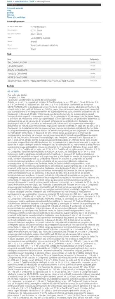 Judecătoria Salonta a pronunțat, pe 5 noiembrie 2025, sentința finală în dosarul privind furtul de butelii din satul Gepiu, județul Bihor. Cinci tineri – trei majori și doi minori la data săvârșirii faptei – au fost găsiți vinovați de furt calificat sau complicitate la furt calificat, fiind obligați să suporte consecințele legale ale acțiunilor lor.