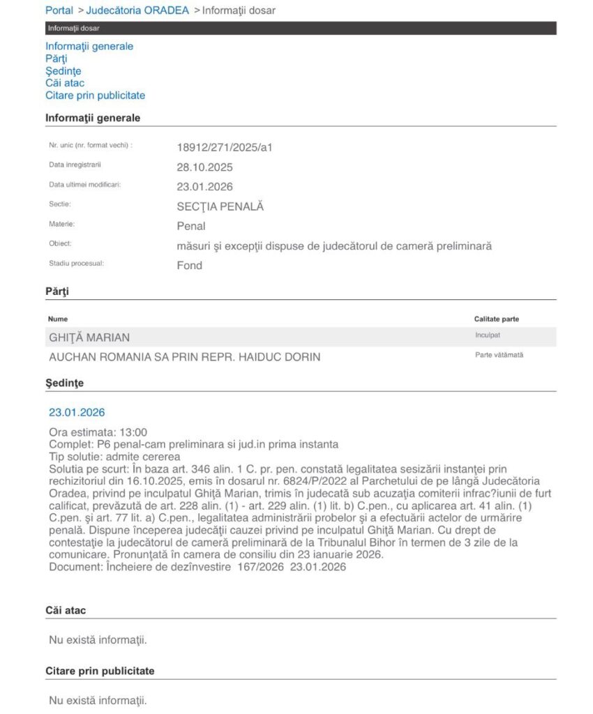 Un dosar penal privind un furt de amploare dintr-un supermarket a intrat oficial în faza de judecată. Instanța a decis că ancheta a fost făcută legal și că procesul poate începe împotriva lui Ghiță Marian, acuzat de furt calificat după ce ar fi sustras produse în valoare de peste 5.200 de lei dintr-un magazin Auchan din Oradea.