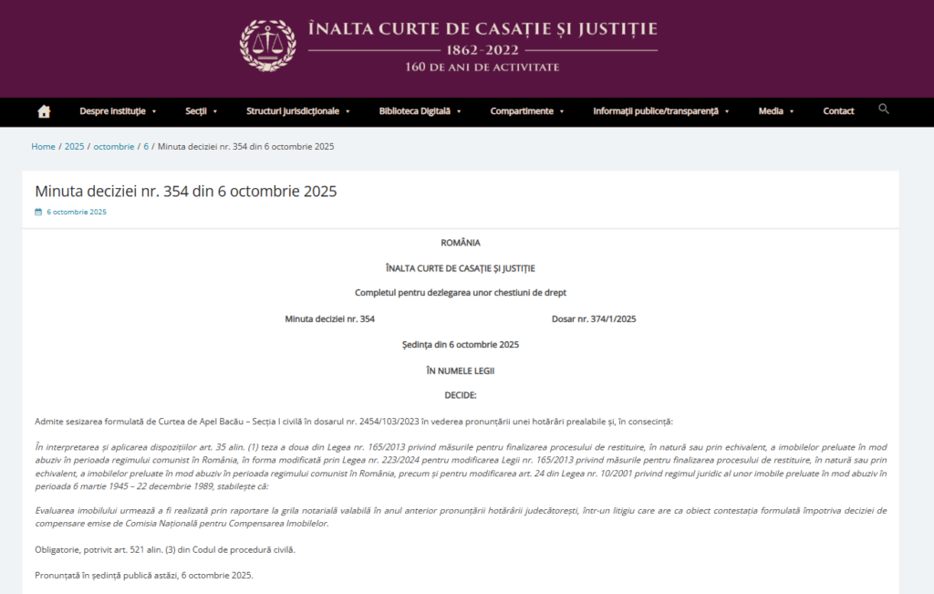 • ÎCCJ, Decizia nr. 354 (HP): Evaluarea imobilelor în dosarele de restituire se face după grila notarială valabilă în anul anterior hotărârii judecătorești