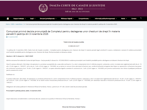 Luni, 3 noiembrie 2025, Înalta Curte de Casaţie şi Justiţie a admis sesizarea formulată de Curtea de Apel Brașov – Secția penală, în dosarul nr. 4722/62/2024, în vederea pronunţării unei hotărâri prealabile pentru dezlegarea următoarei chestiuni de drept și, în consecinţă, stabileşte că: