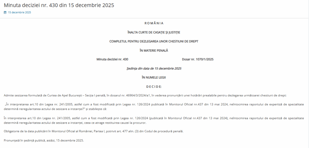 Luni, 15 decembrie 2025, Înalta Curte de Casaţie şi Justiţie a admis sesizarea formulată de  Curtea de Apel Bucureşti – Secţia I penală, în dosarul nr. 46964/3/2024/a1, în vederea pronunţării unei hotărâri prealabile pentru dezlegarea următoarei chestiuni de drept și, în consecinţă, stabileşte că: