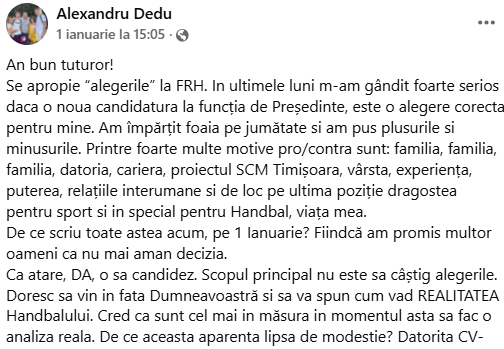 Ca atare, DA, o sa candidez. Scopul principal nu este sa câștig alegerile. Doresc sa vin in fata Dumneavoastră si sa va spun cum vad REALITATEA Handbalului. Cred ca sunt cel mai in măsura in momentul asta sa fac o analiza reala. De ce aceasta aparenta lipsa de modestie? Datorita CV-ului sportiv, datorita multor ani petrecuți in Administrația Sportiva la nivel de top (Președinte LPH, Președinte FRH, Vicepreședinte COSR, Vicepreședinte FRHG, Membru al ComEx al COSR pentru sporturile de iarna), datorita faptului ca nu am “tușit” sa mă “întorc in iarba” si sa muncesc alături de voi, la nivel de Club, unde am trăit si trăiesc toate problemele cotidiene cu care va confruntați. Rezultatele profesionale, familia, atitudinea si comportamentul cred ca mă îndreptățesc sa fac afirmația de mai sus.