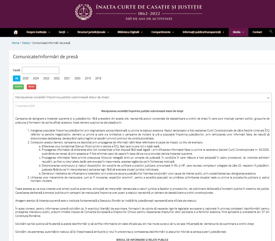 Înalta Curte de Casație și Justiție a emis un comunicat fără precedent prin care denunță o amplă campanie de denigrare și manipulare publică îndreptată împotriva instanței supreme și a judecătorilor săi, campanie în care ar fi implicați actori politici, grupuri de presiune și formatori de opinie.