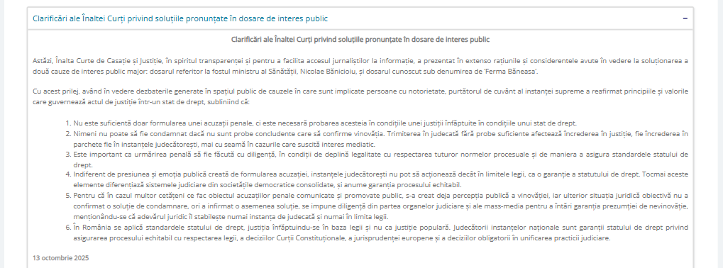 ” Clarificări ale Înaltei Curți privind soluțiile pronunțate în dosare de interes public
