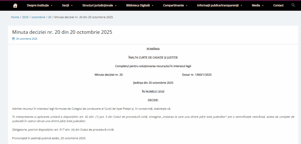 Luni, 20 octombrie 2025, Înalta Curte de Casaţie şi Justiţie a admis recursul în interesul legii formulat de Colegiul de conducere al Curții de Apel Piteşti și, în consecință stabileşte următoarele: