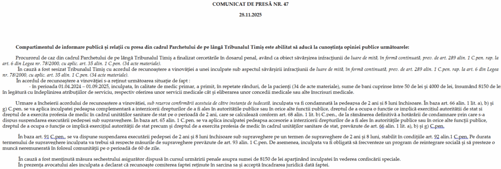 Potrivit acordului, în perioada 1 aprilie 2024 – 1 septembrie 2025, inculpata a primit în mod repetat, de la pacienți, sume cuprinse între 50 și 4.000 lei, totalizând 8.150 lei, în legătură cu acordarea unor servicii medicale, eliberarea concediilor medicale și emiterea altor înscrisuri medicale.