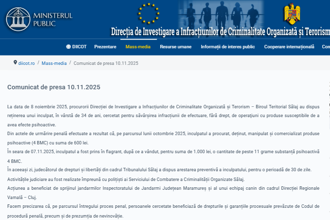 ” La data de 8 noiembrie 2025, procurorii Direcției de Investigare a Infracțiunilor de Criminalitate Organizată și Terorism – Biroul Teritorial Sălaj au dispus reținerea unui inculpat, în vârstă de 34 de ani, cercetat pentru săvârșirea infracțiunii de efectuare, fără drept, de operaţiuni cu produse susceptibile de a avea efecte psihoactive.