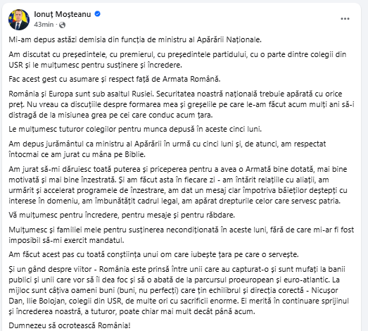 ” Mi-am depus astăzi demisia din funcția de ministru al Apărării Naționale.