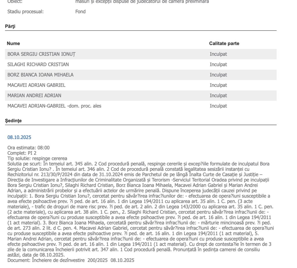 În ședința camerei de consiliu din 8 octombrie 2025, completul PI2 al Tribunalului Bihor a analizat excepțiile ridicate de apărări, însă le-a respins în totalitate. Instanța a constatat că rechizitoriul întocmit de procurorii DIICOT Oradea este legal, iar probele și actele de urmărire penală au fost administrate în conformitate cu dispozițiile Codului de procedură penală. În consecință, judecătorul de cameră preliminară a dispus începerea judecății cauzei.
