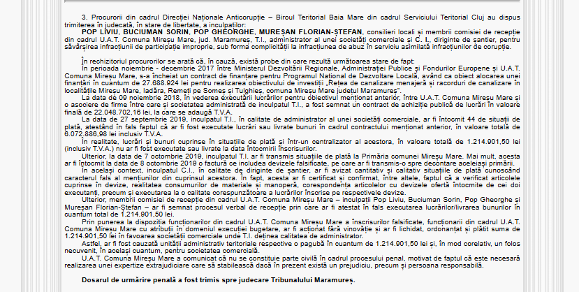 Dosarul de urmărire penală a fost trimis spre judecare Tribunalului Maramureș.” comunică DNA.