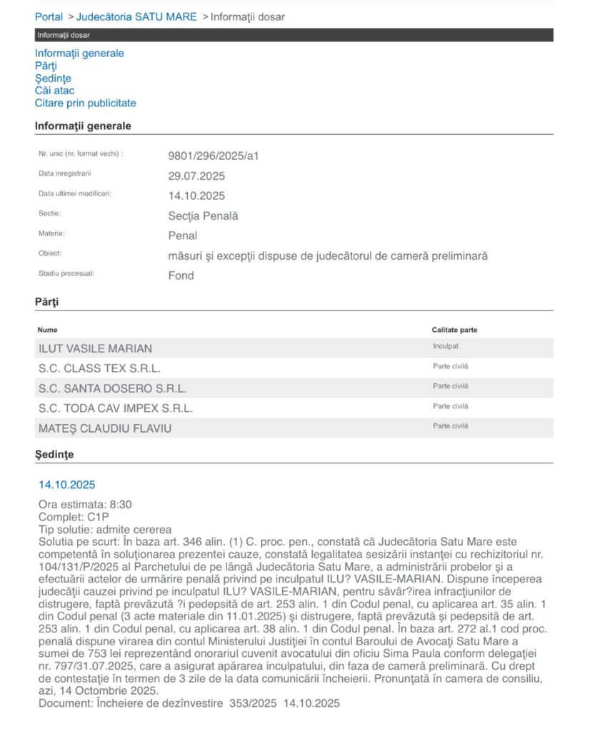 Judecătoria Satu Mare a decis, printr-o încheiere pronunțată în 14 octombrie 2025, începerea judecății în cazul lui Iluț Vasile-Marian, un bărbat din municipiu acuzat că a vandalizat mai multe autoturisme și un imobil în lunile ianuarie și februarie ale acestui an.