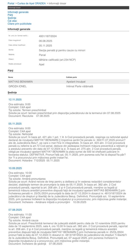 Curtea de Apel Oradea a pronunțat, în 5 noiembrie 2025, decizia definitivă în cazul unui tânăr din zona Șuncuiuș – Beiuș, condamnat pentru tâlhărie calificată. Apelul acestuia a fost respins ca nefondat, iar pedeapsa de patru ani de închisoare, stabilită în iulie 2025 de Judecătoria Beiuș, rămâne în vigoare.