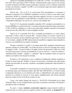 Parchetul de pe lângă Tribunalul Bihor aduce la cunoştinţa opiniei publice că, prin rechizitoriul din data de 12.02.2026, a dispus trimiterea în judecată, în stare de libertate, a inculpatului G I I, pentru săvârşirea următoarelor infracţiuni: trafic de influenţă, prevăzută de art. 291 alin. (1) Cod penal (in raport cu cumpărătoarea de influenţă H R); trafic de influenţă în formă continuată, prevăzută de art. 291 alin. (1) Cod penal, cu aplic. art. 35 Cod penal (faţă de soţii M A şi M A ); trafic de influenţă, prevăzută de art. 291 alin. (1) Cod penal (faţă de denunţătorul Z A I); trafic de influenţă, prevăzută de art. 291 alin. (1) Cod penal (faţă de B B); înşelăciune în formă continuată (două acte materiale), prevăzută de art. 244 alin. (1) şi (2) Cod penal, cu aplic. art. 35 alin. (1) Cod penal (în raport de persoanele vătămate fraţii B‑L L şi B‑L C); Potrivit probelor administrate în cauză, în esenţă s-a reţinut următoarea situaţie de fapt: În perioada 2018–2023, inculpatul G I I ar fi desfăşurat o activitate infracţională sistematică, prin care s-ar fi prezentat, în mod mincinos, drept lucrător al Serviciului Român de Informaţii (SRI) sau persoană „cu funcţie înaltă” şi relaţii în structurile SRI/SIE/MAI/ISU/SMURD şi ar fi pretins şi primit, în mod repetat, de la mai multe persoane (unii dintre ei cupluri de soţi sau fraţi), sume de ordinul zecilor de mii de lei şi al miilor de euro, sub pretextul: -exercitării influenţei asupra unor funcţionari publici sau membri ai comisiilor de examinare, în vederea angajării ori promovării în cadrul SRI, SIE sau SMURD/ISU; -achitării unor aşa‑zise „taxe de înscriere”, „examinări psihologice”, „analize medicale”, „cursuri de pregătire” şi „uniforme” pentru concursuri de admitere care, în realitate, fie nu existau, fie nu presupuneau astfel de plăţi. Astfel: Faţă de H R, inculpatul, prezentându-se ca „ofiţer SRI” („P Ionel”), ar fi pretins şi primit, între 2018–2022, aproximativ 8.000–8.500 euro, sub pretextul unor etape succesive de recrutare în cadrul Academiei/şcolii SRI (examene psihologice, medicale, cursuri, certificări), pretinzând că banii sunt destinaţi „colegilor” din SRI şi că are influenţă asupra persoanelor implicate în procedurile de recrutare; Faţă de soţii M A şi M V, în cursul anului 2023, prezentându-se ca persoană cu influenţă în structurile M.A.I./SMURD, inculpatul ar fi pretins şi primit, în mai multe tranşe, aproximativ 40.000 lei, susţinând că poate determina angajarea acestora ca asistent medical, respectiv şofer de ambulanţă în cadrul SMURD, în schimbul acestor sume şi al „cursurilor” şi „examinărilor psihologice” pe care le-ar fi „rezolvat” prin relaţiile sale; Faţă de Z A I, în perioada septembrie–noiembrie 2021, inculpatul, prezentându-se ca lucrător SRI Bihor cu „putere de decizie”, ar fi pretins şi primit, în mai multe tranşe, aproximativ 27.500–28.000 lei, susţinând că va folosi aceşti bani pentru membrii comisiilor de examinare şi alte persoane din cadrul SRI, în vederea angajării acestuia; Faţă de B B, în perioada 2018–2022, inculpatul, prezentându-se ca având „funcţie importantă” în SRI şi relaţii la structura SRI – Aeroport Oradea, ar fi pretins şi primit de la acesta şi de la părinţii săi sume totalizând aproximativ 5.200 euro (în lei şi euro), sub pretextul că vor fi remise „colegilor din SRI” pentru promovarea probelor şi angajare, deşi examenele nu aveau loc, iar candidatul nu era chemat să participe; În raport cu fraţii B ‑L L şi B‑L C, în toamna anului 2023, inculpatul, folosind în mod mincinos calitatea de „lucrător SRI”, i-ar fi indus în eroare cu privire la existenţa unui concurs de angajare în SRI – Aeroport Oradea şi la natura sumelor de aproximativ 9.000 euro (4.500 euro/persoană) pretinse şi primite, prezentându-le ca „taxe de înscriere”, „cursuri de calificare”, „materiale pentru examen”, „analize” şi „uniforme”, deşi un asemenea concurs nu exista în realitate, iar sumele au fost însuşite de inculpat; În raport cu M A (persoană cu care s a împăcat), în împrejurări similare, inculpatul ar fi indus în eroare persoana vătămată cu privire la necesitatea şi destinaţia unor plăţi pretins aferente unei proceduri de recrutare, cauzându-i un prejudiciu patrimonial (faptă încadrată ca înşelăciune). În ansamblu, inculpatul ar fi creat şi întreţinut, pe o perioadă de mai mulţi ani, o aparenţă de influenţă asupra unor funcţionari publici (din SRI, SIE, SMURD/ISU), ar fi folosit calităţi şi legitimaţii mincinoase şi ar fi exploatat naivitatea şi vulnerabilitatea mai multor persoane interesate de accederea în structuri cu statut special, obţinând pentru sine foloase materiale injuste de ordinul zecilor de mii de lei şi miilor de euro. Cauza a fost iniţial disjunsă din dosarul nr. 281/P/2023 al Parchetului de pe lângă Tribunalul Bihor, în care inculpatul fusese deja trimis în judecată în decembrie 2024 pentru o altă faptă de trafic de influenţă. În cauză s a dispus instituirea sechestrului asigurător asupra bunurilor imobile şi mobile prezente și viitoare, precum și poprirea sumelor de bani deținute de inculpatul G I I, până la concurenţa sumei de 80.000 LEI şi 10.800 euro (echivalentul în lei) , reprezentând suma totală obţinută ca urmare a săvârşirii infracţiunilor de trafic de influenţă. Dosarul a fost înaintat spre judecare Tribunalului Bihor. Facem precizarea că această etapă a procesului penal reprezintă finalizarea investigaţiei penale şi sesizarea instanţei de judecată, cauza urmând a fi soluţionată de judecător, care va verifica legalitatea şi temeinicia acuzaţiilor.