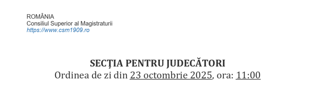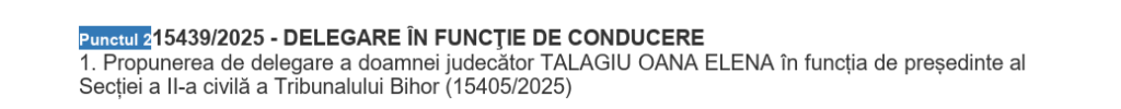 În data de 23.10.2025, în cadrul ședinței Secției pentru judecători din Consiliul Superior al Magistraturii, pe ordinea de zi va fi și delegarea în funcția de președinte al Secției a II-a Civilă a Tribunalului Bihor a doamnei judecător Talagiu Oana Elena.