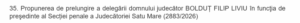 În data de 25.02.2026, în cadrul ședinței Secției pentru judecători din Consiliul Superior al Magistraturii, pe ordinea de zi va fi și prelungirea delegării în funcția de președinte al Secţiei penale a Judecătoriei Satu Mare, a domnului judecător Bolduț Filip-Liviu.