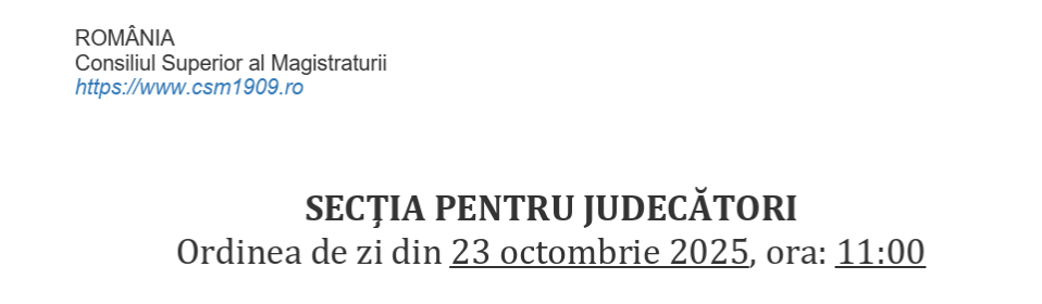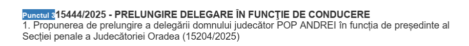 În data de 23.10.2025, în cadrul ședinței Secției pentru judecători din Consiliul Superior al Magistraturii, pe ordinea de zi va fi și prelungirea delegării în funcția de președinte al Secției penale a Judecătoriei Oradea a domnului judecător Pop Andrei.
