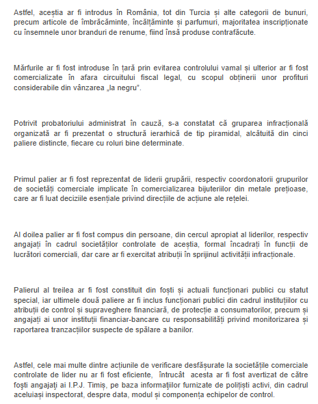 În urma activităților de urmărire penală, s-a constatat că, pe parcursul anului 2024, pe raza județului Timiș, s-a constituit o grupare de criminalitate organizată, formată din peste 30 de membri, condusă de un suspect (cetățean străin), specializată în comercializarea de bijuterii din metale prețioase, o parte dintre acestea fiind introduse ilegal în România din Turcia, cu eludarea prevederilor legale. De asemenea, erau comercializate bijuterii contrafăcute, purtând mărci identice sau similare cu cele înregistrate legal.