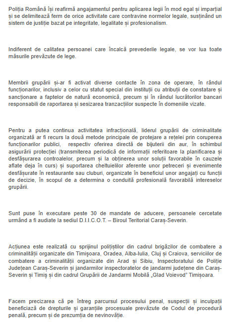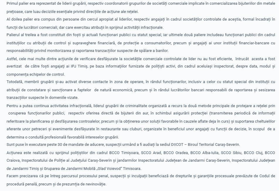 Facem precizarea că pe întreg parcursul procesului penal, suspecții și inculpații beneficiază de drepturile și garanțiile procesuale prevăzute de Codul de procedură penală, precum și de prezumția de nevinovăție.” comunică DIICOT.