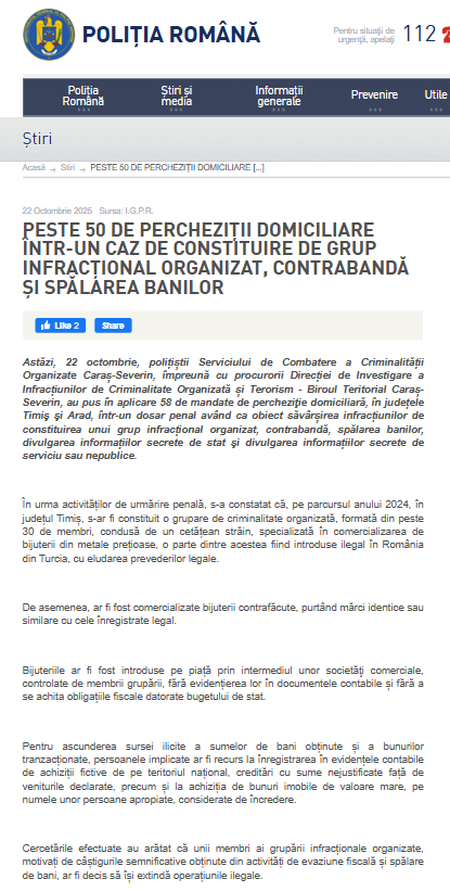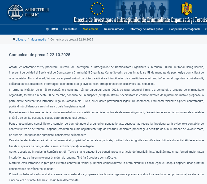 La data de 22 octombrie 2025, procurorii DIICOT – Biroul Teritorial Caraș-Severin, împreună cu polițiștii Serviciului de Combatere a Criminalității Organizate Caraș-Severin, au efectuat peste 50 de percheziții domiciliare pe raza județelor Timiș și Arad, într-un dosar privind constituirea unui grup infracțional organizat, contrabandă și spălare de bani, divulgarea informațiilor secrete de stat şi divulgarea informațiilor secrete de serviciu sau nepublice. Ancheta vizează o rețea formată din aproximativ 30 de membri, care, pe parcursul anului 2024, ar fi introdus în România bijuterii din metale prețioase provenite din Turcia, fără respectarea procedurilor legale. Bunurile erau ulterior comercializate, inclusiv în magazine, sub mărci contrafăcute, pentru a disimula proveniența ilicită. Gruparea ar fi utilizat un mecanism financiar complex pentru spălarea sumelor obținute, implicând persoane interpuse, firme de tip paravan și funcționari publici.