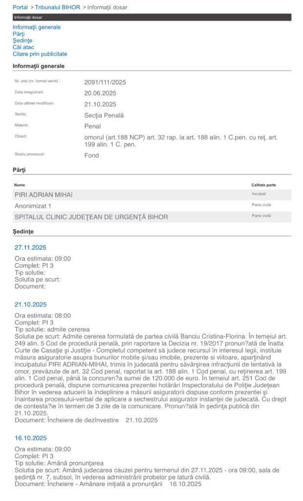 Tribunalul Bihor a admis cererea formulată de partea civilă într-un dosar de tentativă de omor și a dispus instituirea sechestrului asigurator asupra bunurilor mobile și imobile, prezente și viitoare, aparținând inculpatului Adrian Mihai Piri, până la concurența sumei de 120.000 de euro, reprezentând daune morale solicitate de victimă.