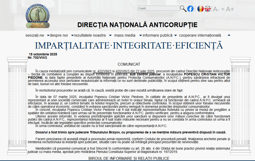 ” În cauza mediatizată prin comunicatele nr. 422/VIII/3 și 420/VIII/3 din 22 iulie 2025, procurorii din cadrul Direcției Naționale Anticorupție – Secția de combatere a corupției au dispus trimiterea în judecată, sub control judiciar, a inculpatului POPESCU CRISTIAN VICTOR PIEDONE, la data faptei președinte al Autorității Naționale pentru Protecția Consumatorilor (A.N.P.C.), pentru săvârșirea infracțiunii de permiterea accesului unor persoane neautorizate la informații ce nu sunt destinate publicității, în scopul obținerii pentru sine sau pentru altul de bani, bunuri ori alte foloase necuvenite.