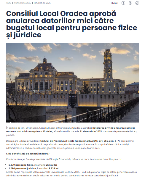 Consiliul Local Oradea a adoptat, în ședința din 29 ianuarie, o hotărâre prin care sunt anulate datoriile foarte mici către bugetul local, înregistrate până la finalul anului trecut. Măsura vizează sumele restante de până la 40 de lei, atât pentru persoane fizice, cât și juridice, și are ca scop eficientizarea activității administrative, în condițiile în care costurile de recuperare depășesc valoarea efectivă a acestor creanțe. Decizia se bazează pe prevederile Codului de procedură fiscală, care permit autorităților locale să stabilească un plafon pentru anularea debitelor minore.