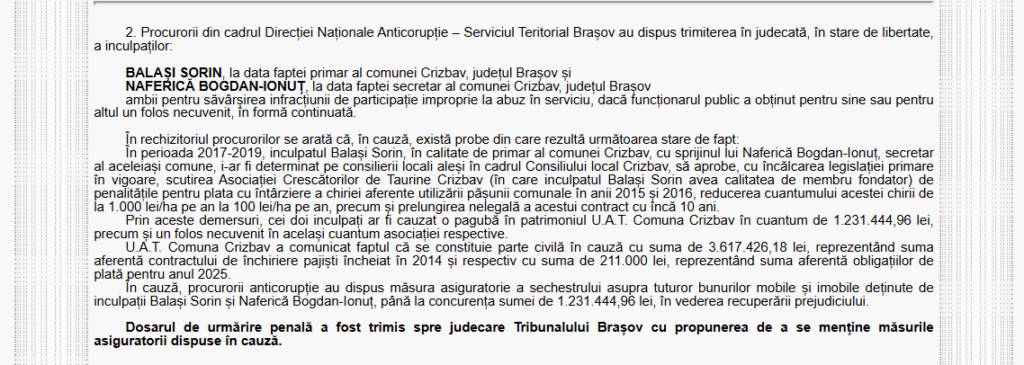 În perioada 2017-2019, inculpatul Balași Sorin, în calitate de primar al comunei Crizbav, cu sprijinul lui Naferică Bogdan-Ionuț, secretar al aceleiași comune, i-ar fi determinat pe consilierii locali aleși în cadrul Consiliului local Crizbav, să aprobe, cu încălcarea legislației primare în vigoare, scutirea Asociației Crescătorilor de Taurine Crizbav (în care inculpatul Balași Sorin avea calitatea de membru fondator) de penalitățile pentru plata cu întârziere a chiriei aferente utilizării pășunii comunale în anii 2015 și 2016, reducerea cuantumului acestei chirii de la 1.000 lei/ha pe an la 100 lei/ha pe an, precum și prelungirea nelegală a acestui contract cu încă 10 ani.