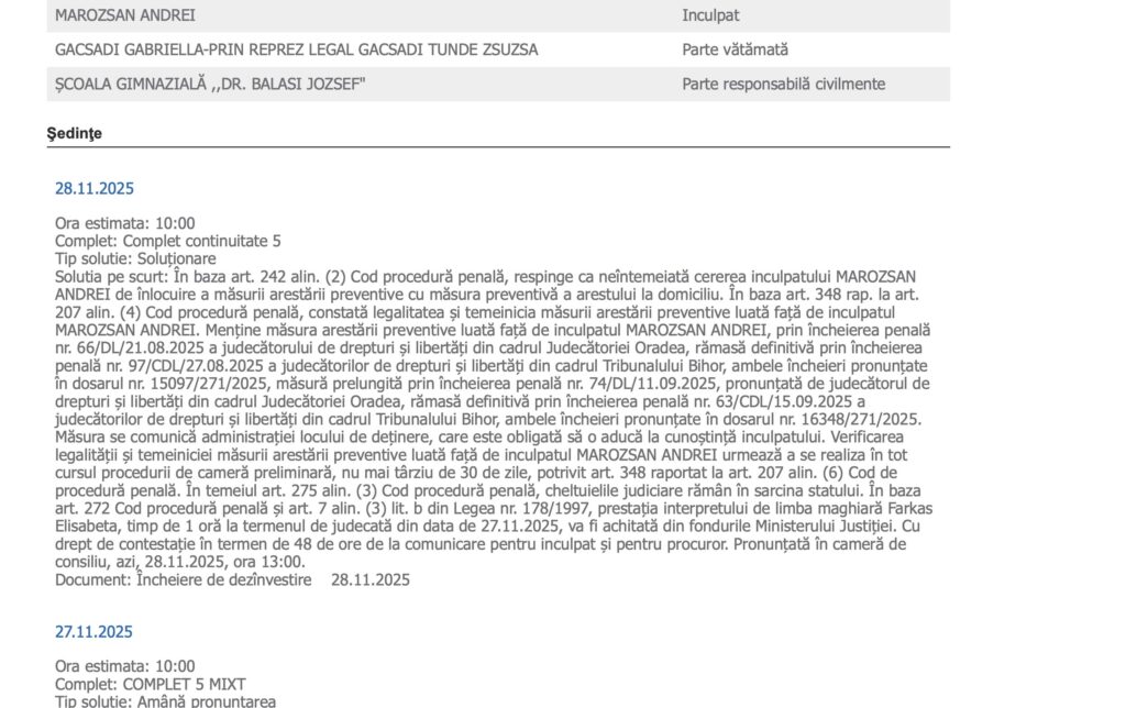 Judecătoria Marghita a decis, în data de 28 noiembrie 2025, menținerea măsurii arestării preventive față de inculpatul Marozsan Andrei, profesor de fizică în vârstă de 47 de ani din cadrul Școlii Gimnaziale „Dr. Balassi József”. Magistratul a respins cererea formulată de inculpat pentru înlocuirea arestului preventiv cu măsura arestului la domiciliu, apreciind că nu sunt îndeplinite condițiile prevăzute de lege pentru o schimbare a regimului preventiv.