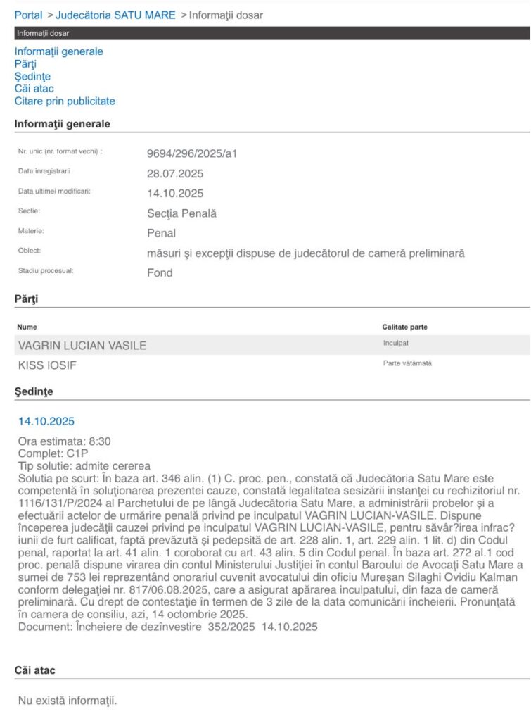 Parchetul de pe lângă Judecătoria Satu Mare a întocmit rechizitoriul, iar dosarul a fost înaintat instanței. În ședința din 14 octombrie 2025, judecătorul de cameră preliminară a analizat probele și actele de urmărire penală și a constatat că acestea au fost realizate cu respectarea legii.
