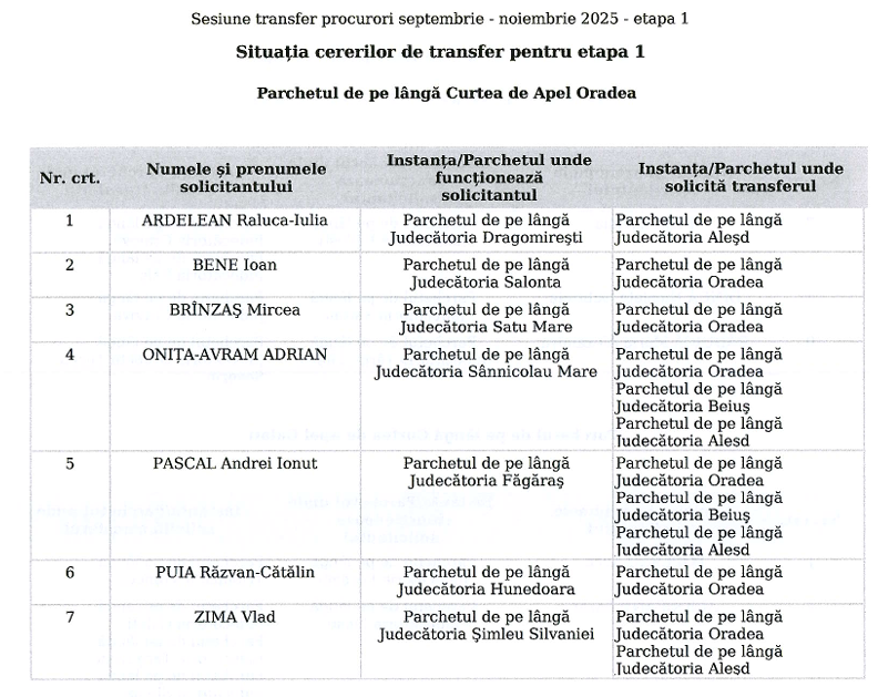 În total, șapte procurori au solicitat mutarea în unitățile de parchet din raza Curții de Apel Oradea, unde sunt disponibile posturi la nivelul parchetelor de pe lângă Tribunalul Bihor, Tribunalul Satu Mare, precum și la parchetele locale din Oradea, Aleșd, Beiuș și Negrești-Oaș.