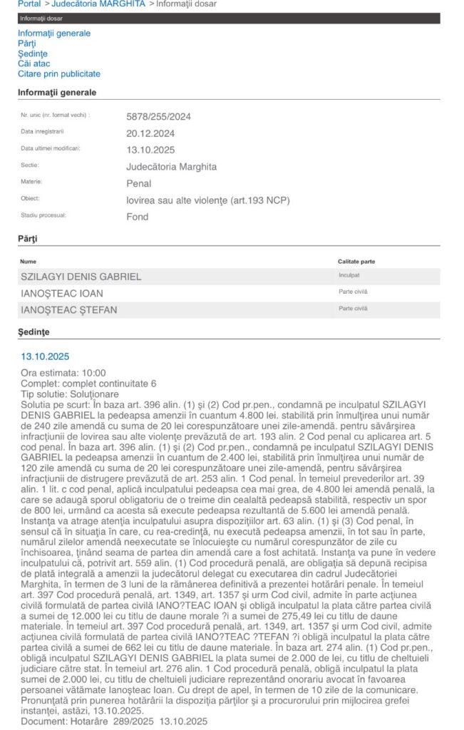 Sentința a fost pronunțată în 13 octombrie 2025, la Judecătoria Marghita, și poate fi atacată cu apel în termen de zece zile de la comunicare.