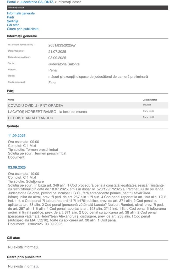 Judecătoria Salonta a decis, pe 3 septembrie 2025, începerea procesului împotriva lui Covaciu Ovidiu, un bărbat fără antecedente penale, acuzat de ultraj, tulburarea ordinii și liniștii publice și distrugere. Decizia a venit după ce judecătorul de cameră preliminară a constatat legalitatea sesizării instanței prin rechizitoriul emis de Parchetul de pe lângă Judecătoria Salonta, la 18 iulie 2025.