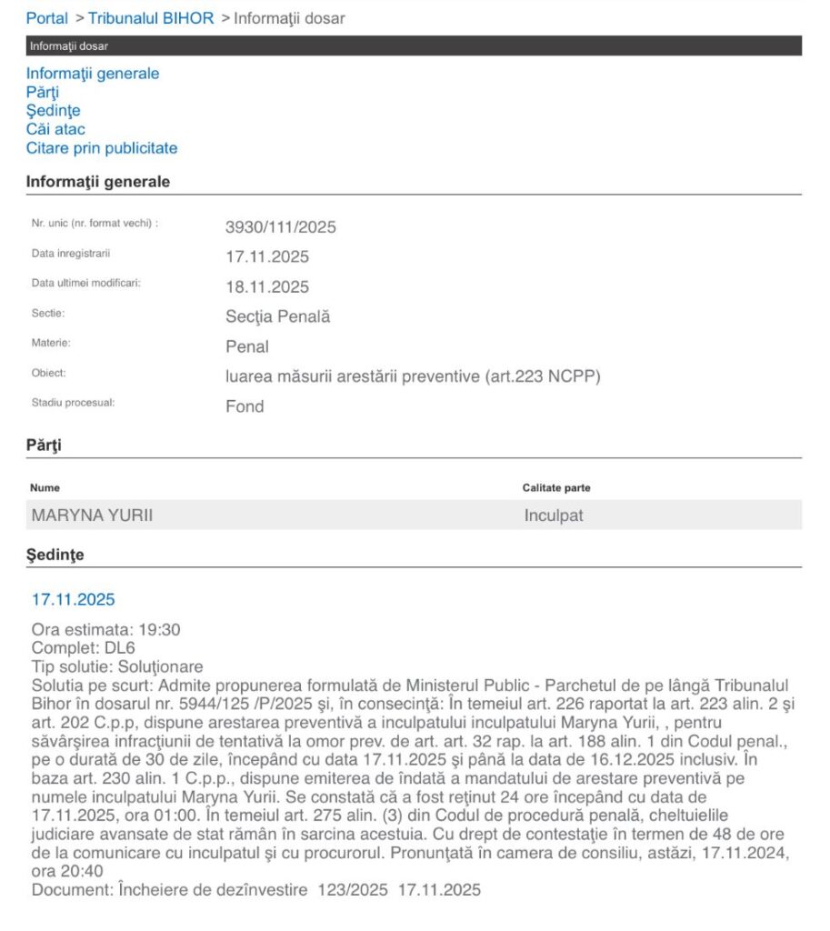 • Arestarea preventivă pentru 30 de zile, din 17.11.2025 până la 16.12.2025