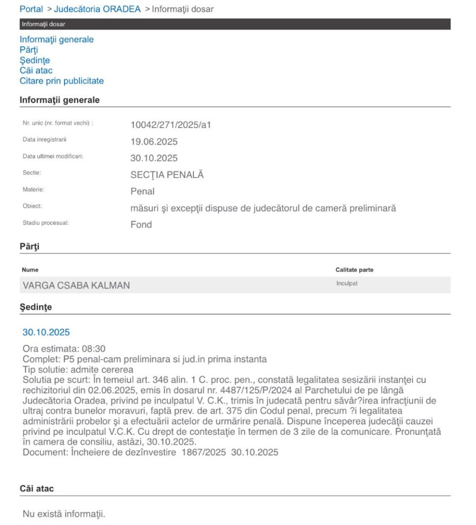 Pe 30 octombrie 2025, Judecătoria Oradea a analizat dosarul în faza camerei preliminare și a decis că toate actele efectuate în timpul anchetei au fost realizate corect.