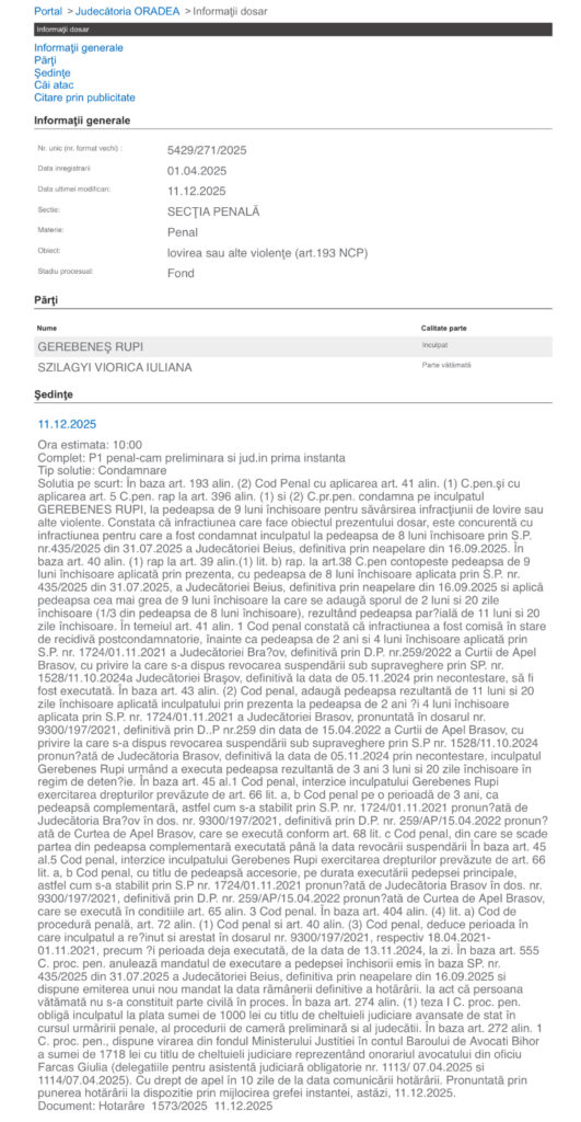 Judecătoria Oradea a pronunțat o condamnare severă în cazul lui Gerebenes Rupi, un inculpat cu numeroase antecedente penale, după ce acesta a fost găsit vinovat de comiterea infracțiunii de lovire sau alte violențe. Pedeapsa finală, care depășește trei ani de detenție, rezultă din cumulul mai multor sancțiuni, contopirea pedepselor anterioare și constatarea stării de recidivă postcondamnatorie.