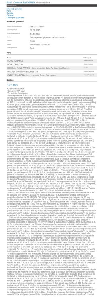 Decizia vine după ce Judecătoria Oradea pronunțase o primă sentință pe 24 iunie 2025, iar inculpații majori au formulat apel. Curtea de Apel a admis apelurile și a reanalizat cazul, stabilind pedepse definitive pentru toți trei.